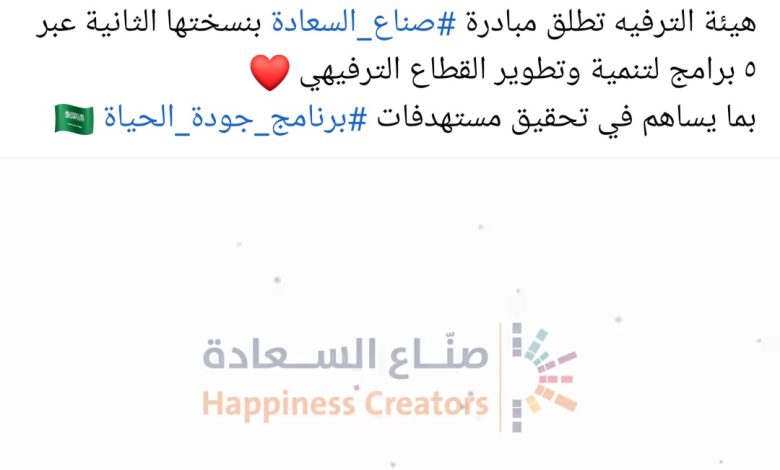 أعلن سعادة المستشار تركي آل الشيخ رهيئة الترفيه بالمملكة العربية السعودية علي صفحته الرسمية عبر الفيس بوك أن: هيئة الترفيه تطلق مبادرة #صناع_السعادة بنسختها الثانية عبر ٥ برامج لتنمية وتطوير القطاع الترفيهي.