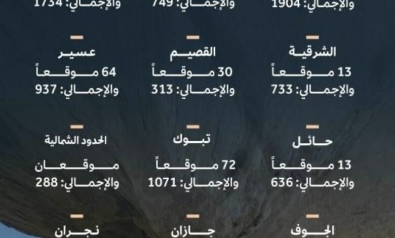 وشملت عملية التسجيل الجديدة مواقع أثرية موزعة على مختلف مناطق المملكة، وهي: منطقة الرياض (253) موقعًا، مكة المكرمة (11) موقعًا، المدينة المنورة (167) موقعًا، منطقة القصيم (30) موقعًا، المنطقة الشرقية (13) موقعًا، منطقة عسير (64) موقعًا، منطقة تبوك (72) موقعًا، منطقة حائل (13) موقعًا، منطقة الحدود الشمالية (موقعان)، منطقة جازان (23) موقعًا، منطقة نجران (86) موقعًا، منطقة الجوف (10) مواقع.