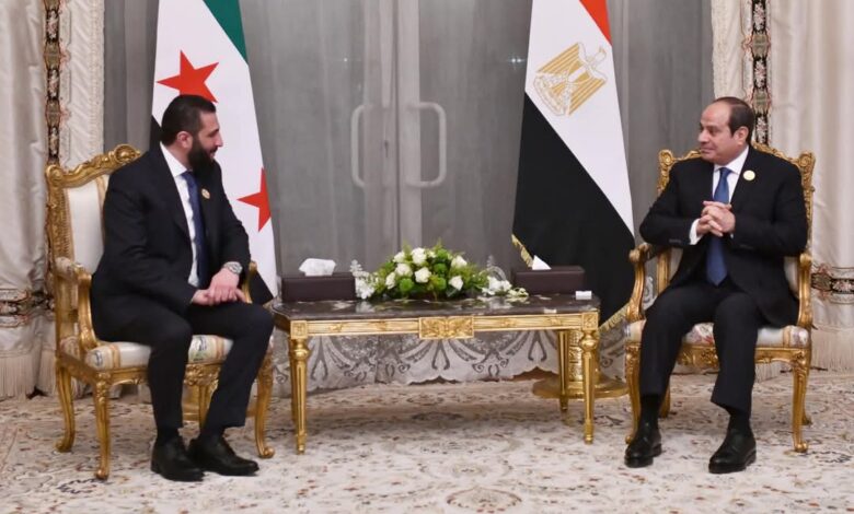 التقى السيد الرئيس عبد الفتاح السيسي رئيس جمهورية مصر العربية بالسيد أحمد الشرع رئيس الجمهورية العربية السورية، وذلك على هامش القمة العربية غير العادية المنعقدة بالعاصمة الإدارية الجديدة.