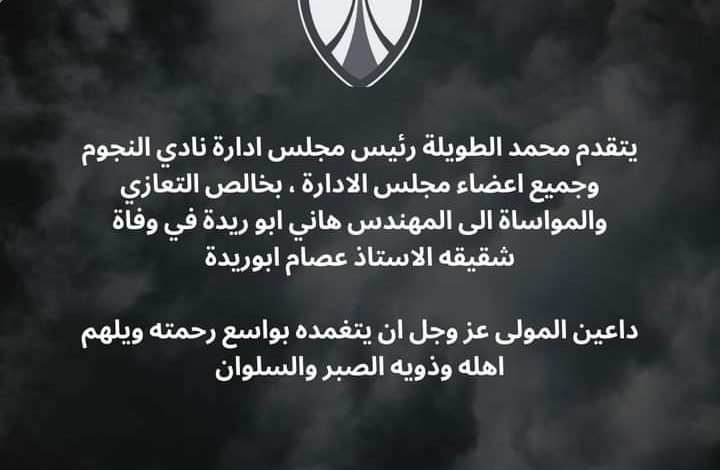 يتقدم محمد الطويلة رئيس مجلس ادارة نادي النجوم وجميع اعضاء مجلس الادارة ، بخالص التعازي والمواساة الى المهندس هاني ابو ريدة في وفاة شقيقه الاستاذ عصام ابوريدة.