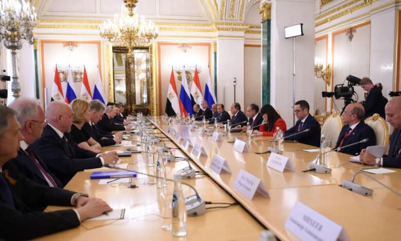 وصرح المتحدث الرسمي باسم رئاسة الجمهورية بأن الرئيسين عقدا جلسة مباحثات موسعة بحضور وفدي البلدين، استهلها الرئيس بوتين بالاعراب عن تقديره لمشاركة السيد الرئيس في الاحتفال هذا العام، مما يعكس العلاقات الراسخة والتاريخية التي تربط بين البلدين والشعبين الصديقين. من ناحيته، وجه السيد الرئيس عبدالفتاح السيسي التهنئة للرئيس الروسي والشعب الروسي بمناسبة عيد النصر، مشيدًا بعلاقات مصر الاستراتيجية مع روسيا، التي تستند إلى اتفاقية الشراكة الاستراتيجية الشاملة المبرمة بين البلدين عام ٢٠١٨، معرباً سيادته عن التقدير للزخم الذي تشهده العلاقات الثنائية بين البلدين في مختلف المجالات، بما في ذلك إنشاء المنطقة الصناعية الروسية في المنطقة الاقتصادية لقناة السويس، وإنشاء محطة الضبعة لتوليد الكهرباء بالطاقة النووية، واعرب الرئيسان عن تطلعهما الى نجاح اللجنة المشتركة بين البلدين خلال شهر مايو الجاري والتي سوف تتناول سبل تعزيز العلاقات الثنائية في كافة المجالات ذات الاهتمام المشترك.