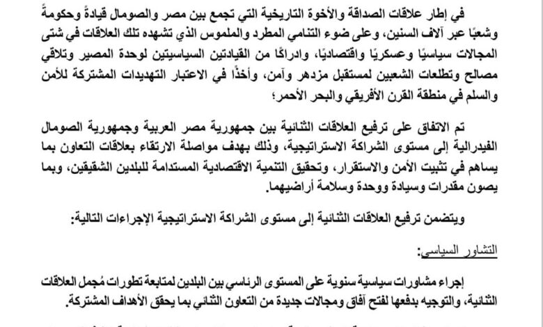 بالمستندات إعلان ترفيع العلاقات بين مصر والصومال إلي مستوي الشراكة الإستراتيجية