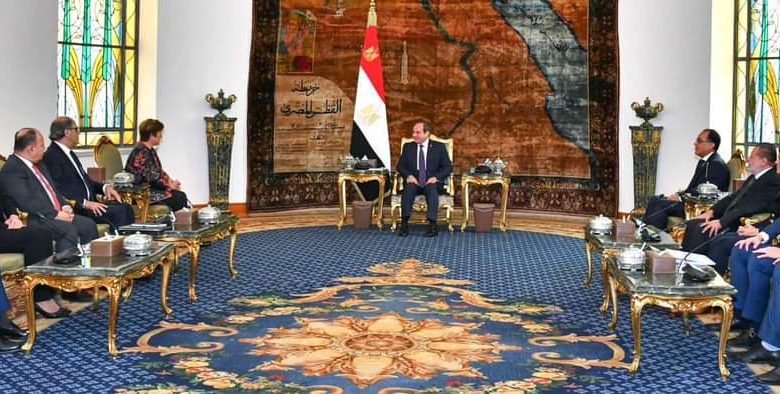 Today, President Abdel Fattah El-Sisi received Managing Director of the International Monetary Fund, Kristalina Georgieva and her accompanying high-level delegation. The meeting was also attended by Prime Minister, Dr. Moustafa Madbouly; Governor of the Central Bank of Egypt, Mr. Hassan Abdallah; Minister of Planning, Economic Development and International Cooperation, Dr. Rania Al-Mashat; and Minister of Finance, Ahmed Kouchouk.