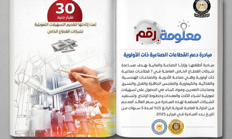 مبادرة أطلقتها وزارتا الصناعة والمالية بهدف مساعدة شركات القطاع الخاص العاملة في 7 قطاعات صناعية ذات أولوية وهي صناعة الأدوية، والصناعات الهندسية، والغذائية، والكيماوية، والملابس الجاهزة والغزل والنسيج، وصناعات التعدين، ومواد البناء، في الحصول على تسهيلات تمويلية لشراء الآلات والمعدات وخطوط الإنتاج. وتستفيد الشركات المنضمة لهذه المبادرة من سعر العائد المدعم من الخزانة العامة للدولة البالغ 15% لمدة 5 سنوات من تاريخ بدء المبادرة في فبراير 2025 .