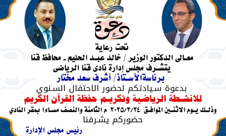 “تحت رعاية معالي الدكتور الوزير خالد عبدالحليم، محافظ قنا، يتشرف مجلس إدارة نادي قنا الرياضي، برئاسة الأستاذ أشرف سعد مختار، بدعوة سيادتكم لحضور الاحتفال السنوي للأنشطة الرياضية وتكريم حفظة القرآن الكريم، وذلك يوم الإثنين الموافق 24 /3 / 2025، في تمام الساعة الثامنة والنصف مساءً، بمقر النادي. حضوركم يشرفنا.”
