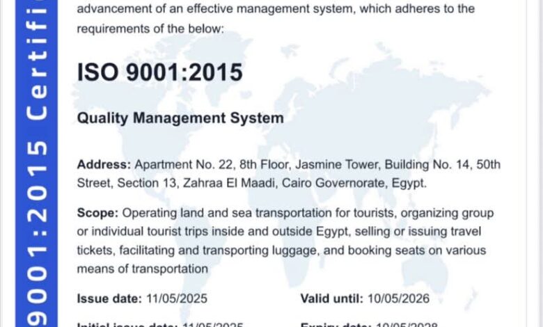 بأسمى آيات التهاني والتبريكات إلى فريق العمل وجميع شركائنا بمناسبة حصول الشركة على شهادة ISO 9001:2015 الدولية، والتي تعكس التزامنا الراسخ بتطبيق أعلى معايير الجودة في تقديم خدمات السياحة والسفر.