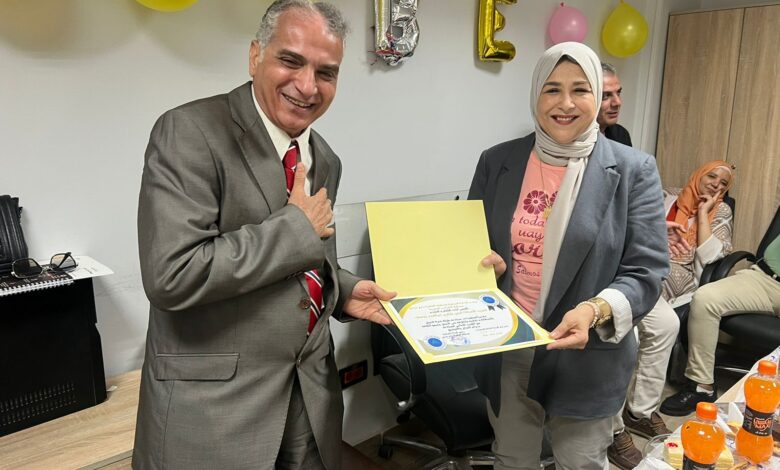وأعرب الأستاذ أيمن شكري إبراهيم في كلمته عن امتنانه العميق لهذا التكريم، موجّهًا الشكر لكل من ساهم في تنظيم الحفل، قائلاً: “أشكر من أعماق قلبي جميع زملائي وزميلاتي في الإدارة والمنطقة، وعلى رأسهم الأستاذة أسماء العشري والأستاذ أشرف جمال، على هذا الحفل الذي أعدّه مسك ختام لمسيرتي الوظيفية. لقد دعوت الله أن تكون خاتمتي في العمل بين خير الناس، فاستجاب لي، ووهبني هذه القلوب الطيبة التي سأظل أفتخر بها وأذكرها بكل خير”.