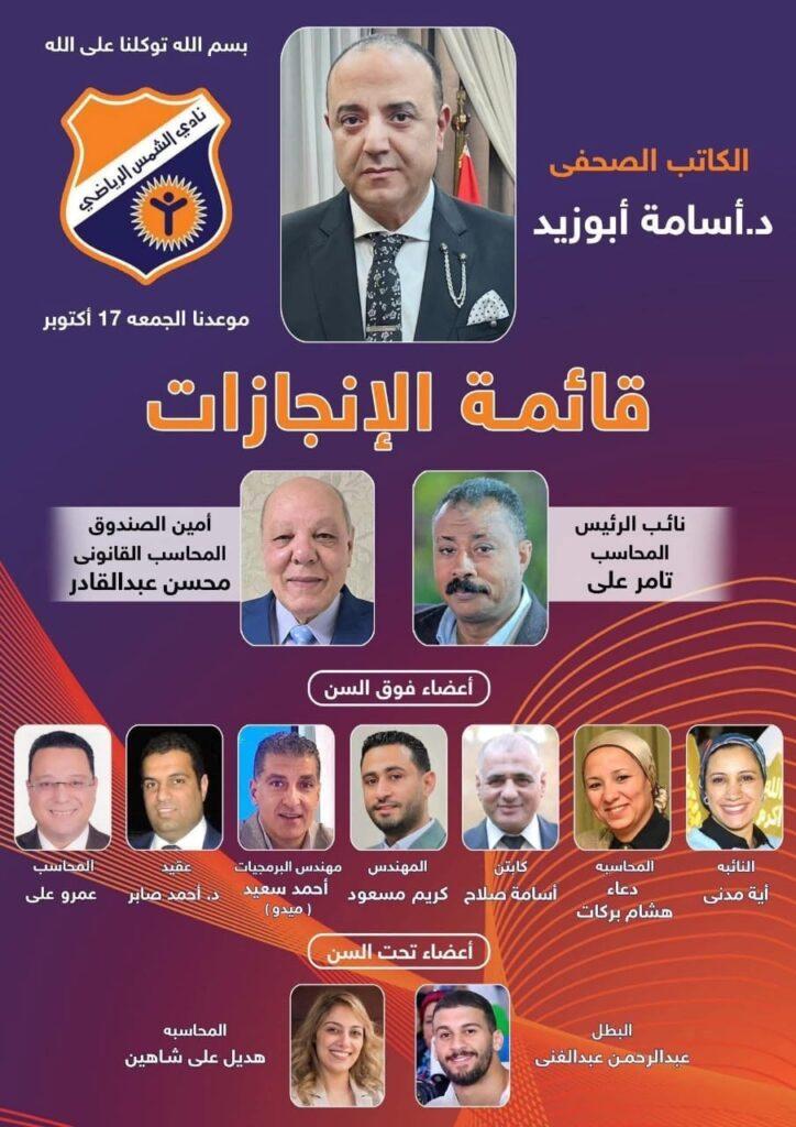 كما يتقدم الكابتن مصطفى فكري، بخالص التهاني والتبريكات لأسرة مجلس إدارة نادي الشمس بالكامل وهم كل من :ـ الدكتور أسامة أبوزيد رئيسًا لمجلس الإدارة، المحاسب تامر علي نائبًا للرئيس، المستشار محسن عبدالقادر أمينًا للصندوق، النائبة آية مدني، المحاسبة دعاء هشام بركات، الكابتن أسامة صلاح، المهندس كريم مسعود، الكابتن أحمد سمير، المهندس أحمد سعيد “ميدو”، المحاسب عمرو علي أعضاء مجلس إدارة فوق السن، الكابتن هديل شاهين والكابتن عبدالرحمن عبدالغني أعضاء مجلس إدارة تحت السن.