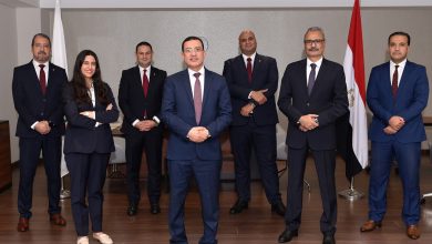 رشا عبدالعال رئيس مصلحة الضرائب ومعها رؤساء المصلحة السابقون الدكتور محمود محمد علي والدكتور مصطفى عبدالقادر وعبدالمنعم مطر ومختار توفيق يحتفلون بتكريم حامد عقل في يوم وفائه وبلوغه السن القانونية