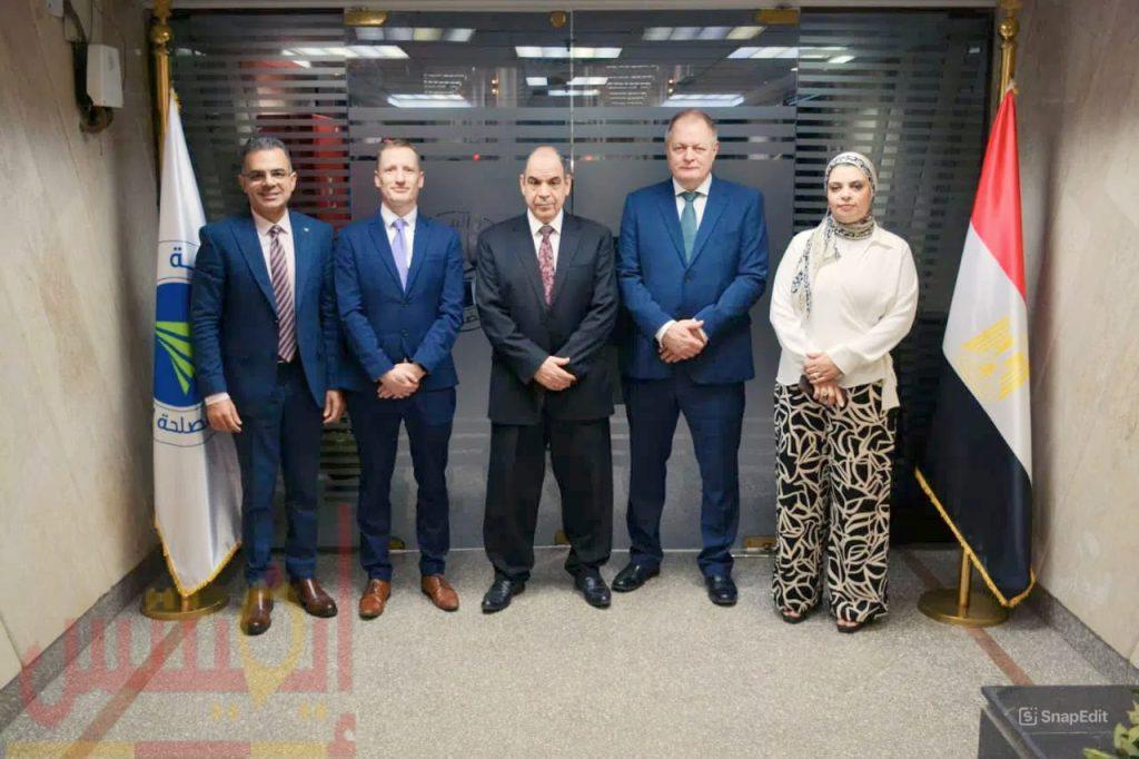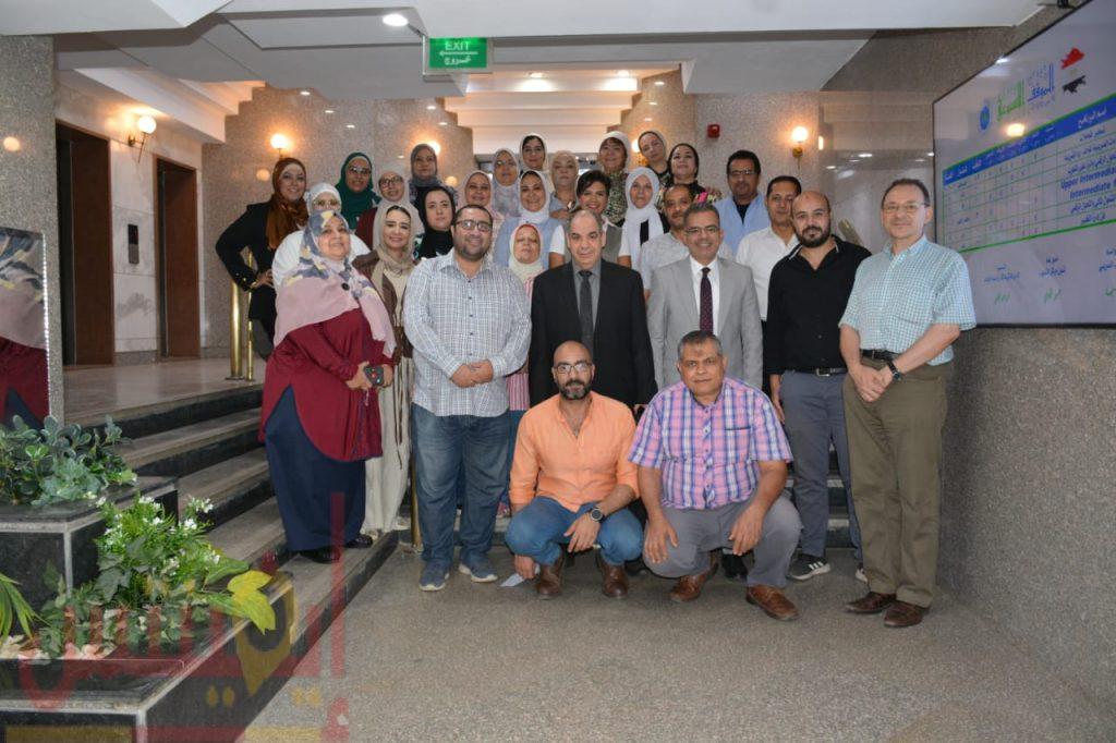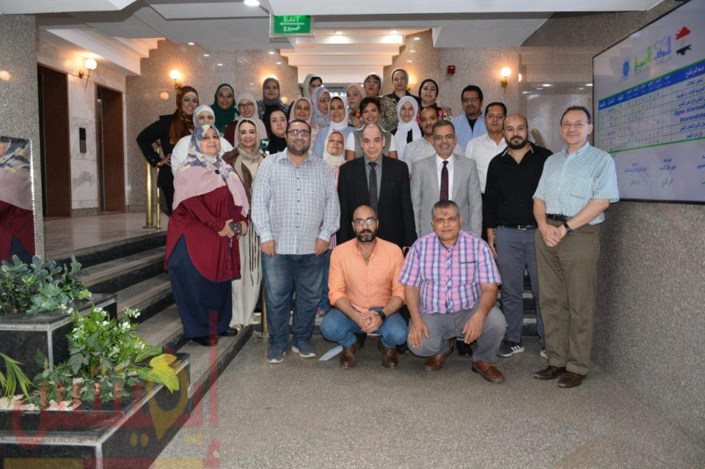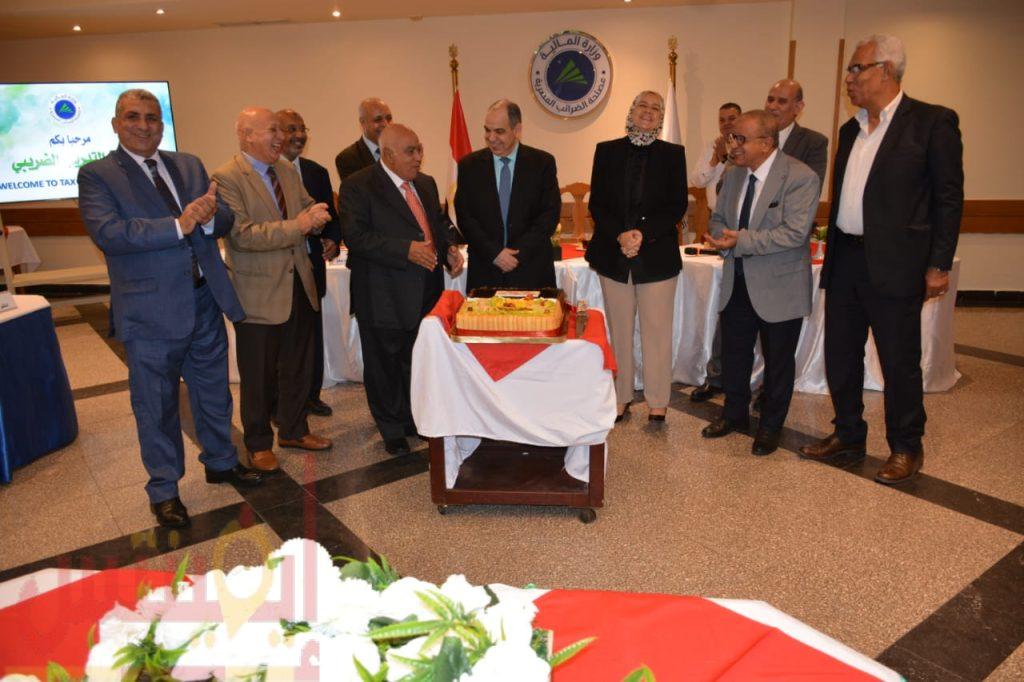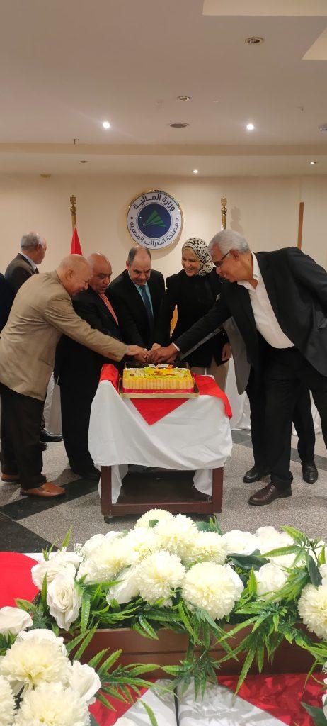 رشا عبدالعال رئيس مصلحة الضرائب ومعها رؤساء المصلحة السابقون الدكتور محمود محمد علي والدكتور مصطفى عبدالقادر وعبدالمنعم مطر ومختار توفيق يحتفلون بتكريم حامد عقل في يوم وفائه وبلوغه السن القانونية