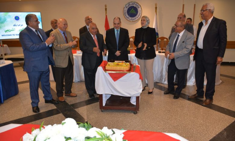 رشا عبدالعال رئيس مصلحة الضرائب ومعها رؤساء المصلحة السابقون الدكتور محمود محمد علي والدكتور مصطفى عبدالقادر وعبدالمنعم مطر ومختار توفيق يحتفلون بتكريم حامد عقل في يوم وفائه وبلوغه السن القانونية