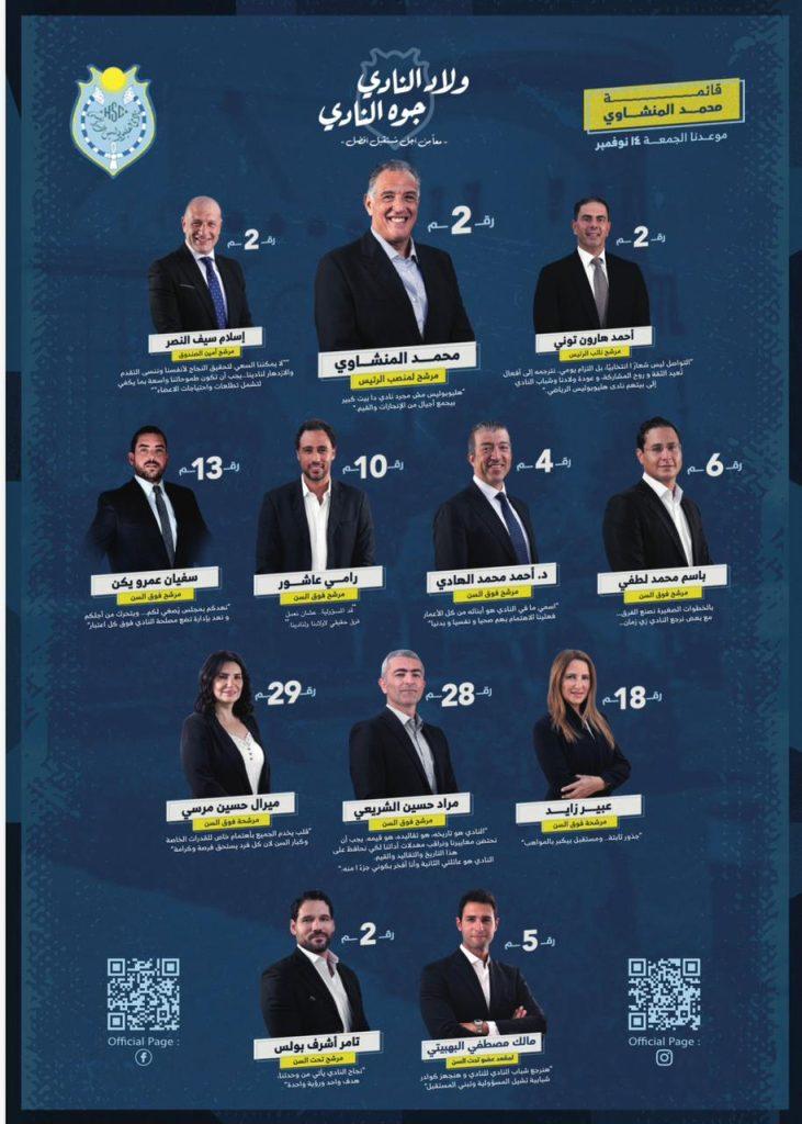 وتضم القائمة كلًا من: محمد المنشاوي مرشحًا لرئاسة النادي، أحمد هارون التوني مرشحًا لمنصب نائب رئيس مجلس الإدارة، إسلام سيف النصر مرشحًا لمنصب أمين الصندوق.
