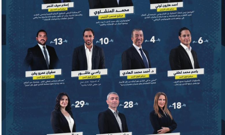أما مرشحو عضوية مجلس الإدارة فهم: باسم محمد لطفي، والدكتور أحمد محمد الهادي، ورامي عاشور، وسفيان عمرو يكن، وعبير زايد، ومراد حسين الشريعي، وميرال حسين مرسي، ومالك مصطفى الهبيتي، وتامر أشرف بوليس.