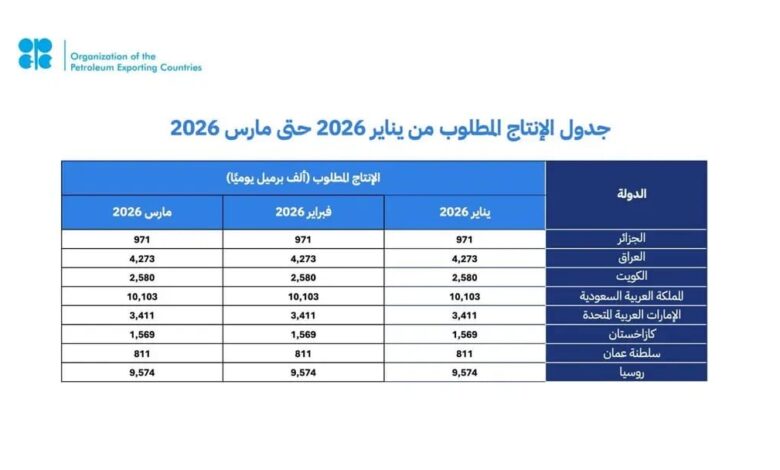 وجددت الدول الثماني المشاركة التأكيد على قرارها في 2 نوفمبر 2025م، بتعليق الزيادات في الإنتاج خلال أشهر يناير وفبراير ومارس من عام 2026م، نظرًا للعوامل الموسمية، كما هو موضح في الجدول أدناه.