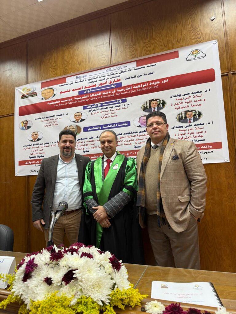 د. هاني سباعي نصار يهنئ د. طارق أنور غنيم بحصوله على الدكتوراه المهنية في المحاسبة في دراسة تؤكد دور جودة المراجعة الخارجية في تحقيق العدالة الضريبية