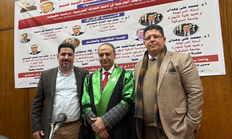 وجاءت رسالة الدكتوراه بعنوان بحثي متميز تناول دور جودة المراجعة الخارجية في دعم العدالة الضريبية، وذلك بالتطبيق على عينة من الأكاديميين والمهنيين والمديرين الماليين بالشركات، إلى جانب المختصين في الإدارة الضريبية، بما يعكس عمق الدراسة وأهميتها العملية والعلمية.
