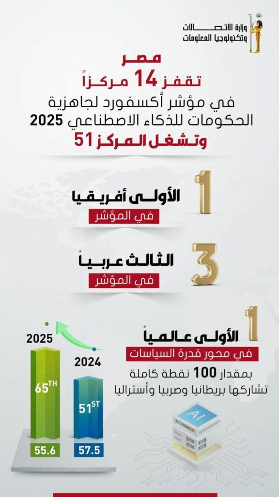 مصر تتربع علي عرش أفريقيًا فى مؤشر جاهزية الحكومات للذكاء الاصطناعى لعام 2025 الصادر عن Oxford Insights وتحصد المركز الأول