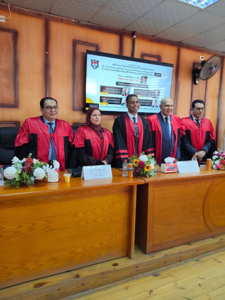 وتكونت لجنة المناقشة والحكم والإشراف على رسالة الدكتوراه من نخبة من كبار أساتذة القانون في مصر ، وهم: الأستاذة الدكتورة سحر عبد الستار إمام، أستاذ ورئيس قسم قانون المرافعات المدنية والتجارية وعميد كلية الحقوق (السابق) بجامعة مدينة السادات، والأستاذ الدكتور ماهر جميل أبو خوات، أستاذ القانون الدولي العام وعميد كلية الحقوق بجامعة كفر الشيخ.