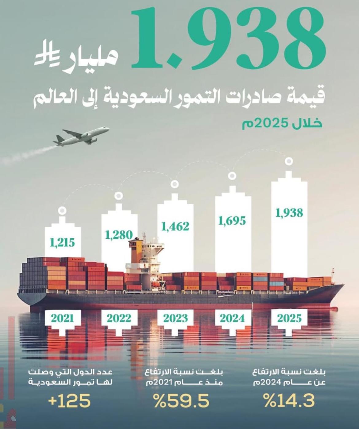 حقّقت المملكة العربية السعودية نموًّا قياسيًا في قيمة صادرات التمور خلال عام 2025م، بتسجيل ارتفاع بنسبة 14.3% مقارنةً بعام 2024م، و59.5% منذ عام 2021م، حيث بلغت قيمة الصادرات 1.938 مليار ريال؛ مما يؤكّد تطور قطاع النخيل والتمور في المملكة، وارتفاع جودة التمور السعودية وكفاءتها الإنتاجية، وتعزيز ريادتها وسيطرتها على الأسواق العالمية؛ بما يسهم في رفع مساهمة القطاع الزراعي بالناتج المحلي الإجمالي، ودعم الاقتصاد الوطني، وفقًا لمستهدفات رؤية المملكة 2030.