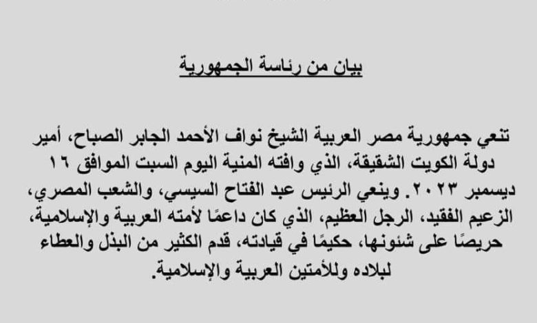 الرئيس السيسي ينعي وفاة الشيخ نواف الأحمد الجابر الصباح أمير دولة الكويت ويعلن الحداد علي الفقيد لثلاثة أيام في جميع أنحاء البلاد