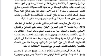 تفاصيل..بيان القاهرة الصادر عن القمة العربية غير العادية قمة فلسطين بالعاصمة الإدارية