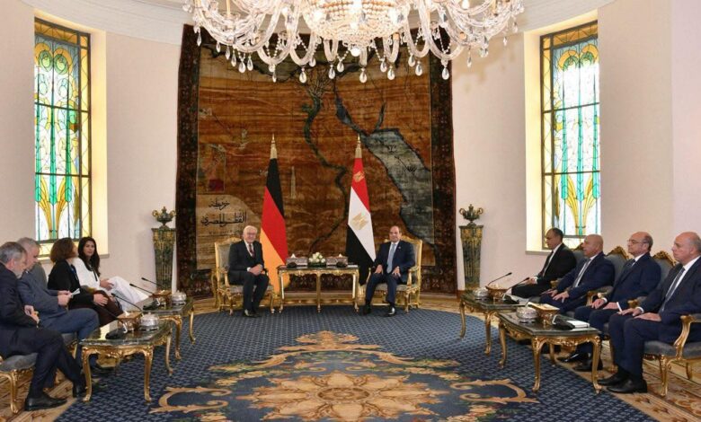 استقبل السيد الرئيس عبد الفتاح السيسي رئيس جمهورية مصر العربية ، أمس ، الرئيس فرانك فالتر شتاينماير، رئيس جمهورية ألمانيا الاتحادية، وذلك بحضور السيد المهندس كامل الوزير، نائب رئيس مجلس الوزراء للتنمية الصناعية وزير الصناعة والنقل، والسيد الدكتور بدر عبد العاطي، وزير الخارجية والهجرة وشئون المصريين في الخارج، ومن الجانب الألماني الدكتورة دورت دينجر، وكيل الوزارة بمكتب رئيس الجمهورية، والسيدة سيراب جولر، وكيل الوزارة بوزارة الخارجية، والسفير فولفجانج دولد، المدير العام للعلاقات الخارجية في رئاسة الجمهورية، والسفير يورجن شولس، سفير جمهورية ألمانيا الاتحادية بالقاهرة.