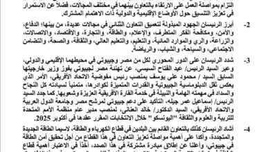 البيان المشترك المصري الجيبوتي بمناسبة زيارة الرئيس عبد الفتاح السيسي إلى جيبوتي