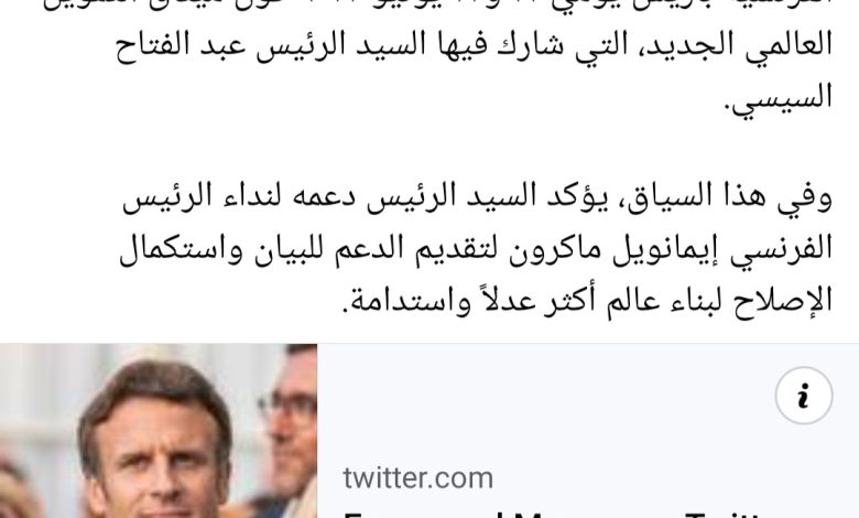 وفي هذا السياق، يؤكد السيد الرئيس عبدالفتاح السيسي دعمه لنداء الرئيس الفرنسي إيمانويل ماكرون لتقديم الدعم للبيان واستكمال الإصلاح لبناء عالم أكثر عدلاً واستدامة.