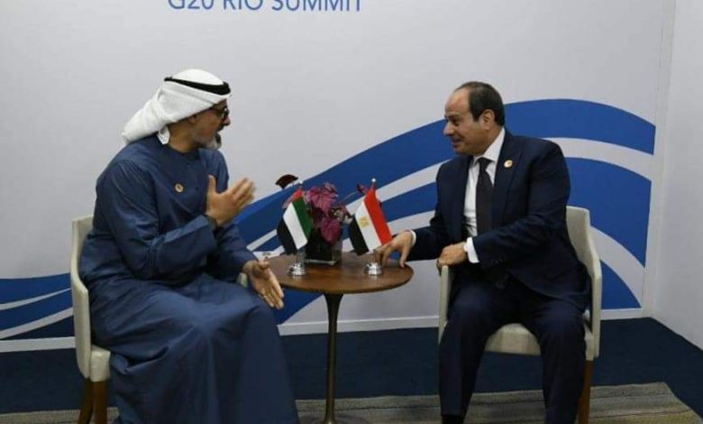 قابل السيد الرئيس عبد الفتاح السيسي رئيس جمهورية مصر العربية مساء أمس سمو الشيخ خالد بن محمد بن زايد آل نهيان، ولي عهد أبوظبي ، وذلك على هامش فعاليات قمة مجموعة العشرين في “ريو دي جانيرو” بالبرازيل، حيث تناولت المقابلة سبل تعزيز العلاقات الوثيقة بين البلدين، في ضوء ما يربطهما من أواصر تاريخية وطيدة على المستويين الشعبي والرسمي، بقيادة السيد الرئيس عبد الفتاح السيسي وسمو الشيخ محمد بن زايد آل نهيان، وقد تم في هذا الإطار التشديد خلال اللقاء على حرص الدولتين على استمرار التعاون والتنسيق في مختلف المجالات، بما يحقق تطلعات شعبيهما الشقيقين نحو التنمية والتقدم.